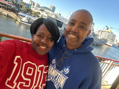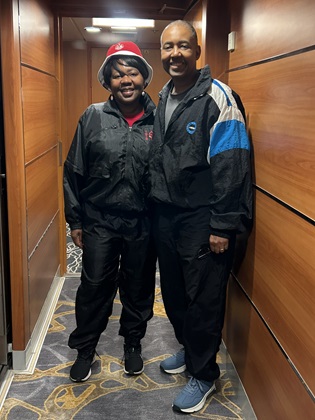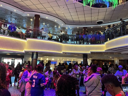 We strolled by the Atrium again where the sail-away party was still in full swing. Our first of four theme nights was Represent Night during which you wear clothing representing your hometown, favorite sports team, university, fraternity/sorority, etc... I was wearing my Hampton University hoodie and Traci was wearing her Delta Sigma Theta sorority clothing. We met several Hampton alumni that day. Traci met many sorors from all around the country. It was our first day on the ship and we were already feeling like one big happy family.