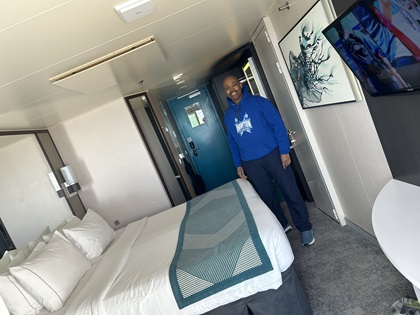 After our muster station visit, Traci and I finally made our way to our cabin (#9556). We had a balcony cabin with ample room for storing luggage under the bed and hanging clothes in the closet. Our cabin had a refrigerator containing ridiculously expensive beverages. We replaced them with the sodas and waters we brought with us. Our cabin steward stopped by to introduce himself and to drop off our luggage. He did an excellent job keeping our room clean during our 4-night stay.