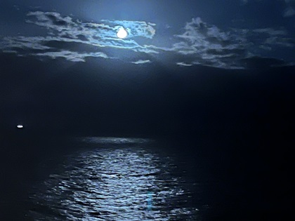 Traci was determined to get her 10k steps for the day, so off we went to the jogging/walking track of the upper deck. It was a windy night but what a beautiful full moon reflecting off the sea. We noticed that the ship had stopped. We could see the city lights of Cancun, Mexico along the shore in the distance. I am assuming the medical evacuation was taking place even though I did not see a helicopter or another boat/ship.