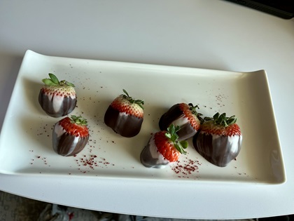 Traci and I have done enough Norwegian cruises to make it to Platinum level in their loyalty program. As a result, we had two bottles of water and a welcome letter waiting for us in our cabin. Shortly after we entered, a crew member stopped by to give us a gift of chocolate-covered strawberries. This caused Traci and me to say, "Uh oh!" and then laugh because the last time we received chocolate-covered strawberries, it was a consolation gift from a Mexican resort after Traci provided "needs improvement" feedback on the resort's customer satisfaction survey. To this day, we suspect that those strawberries were the cause of the case of Montezuma's Revenge that I ended up getting. I was the only person who ate them at the time. We joked that the resort tried to poison us because of Traci's feedback. Fortunately, we had no problem with the chocolate-covered strawberries we received from Norwegian. They were delicious.