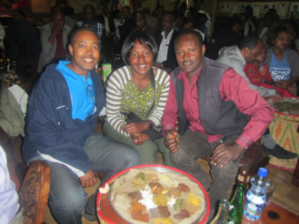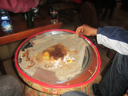 Dining in Ethiopia is quite different from what we are used to in the U.S.. Food is served on a spongy sour bread called injera. You tear off a piece of the injera and use it to pick up your food. There are no eating utensils. You eat with your right hand only. Eating with your left hand is considered bad table manners. You and your tablemates normally eat off the same dish.