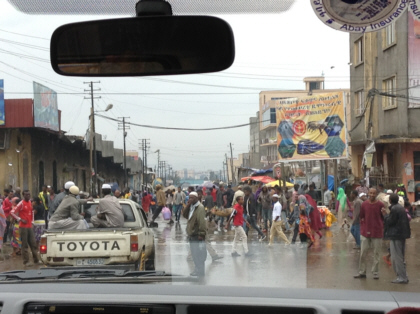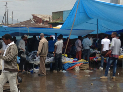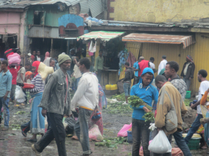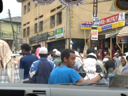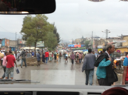 Relieved that our photo ordeal was behind us, we continued on to our final scheduled destination of the tour – the Mercato. The Mercato is a huge open-air market that not only expands blocks but square miles! Everything from livestock to electronics is sold there. We were told that there would not be much activity or people there during our visit because it was Sunday. Upon arriving in the Mercato vicinity, it became obvious to me that there was a difference between my idea of a crowd and our guide’s idea of crowd. To me, the place was packed. Our driver drove slowly through the crowd. Sometimes he would back up in order to turn the van around. I was always afraid that we were going to hit one or several of the pedestrians. We were just centimeters away from them on all sides of the van. If we were to drive that close to a pedestrian in the U.S., the person would probably be ready to fight or at least have some unpleasant words for the driver. But this is not the case in Ethiopia. They seem to take it all in stride.