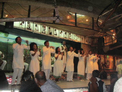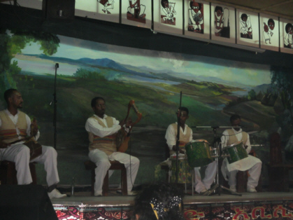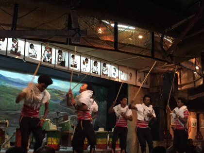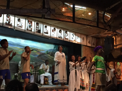 There was constant live entertainment on the stage at the restaurant. As I mentioned earlier, Ethiopia is comprised of more than 80 ethnic groups, each with their own language, customs, and music. The entertainers at the restaurant performed music and dance representative of many of these groups. Even though I did not understand the language, I really enjoyed the performances. The performers changed costumes many times throughout the evening. Their dances involved a lot of shoulder and head shaking. The performers were accompanied by four instrumentalists who were playing a flute-like instrument, drums, and string instruments I had not seen before. At times, the music reminded me of Bollywood music from India. Other times, it sounded kind of Irish. Often the music sounded like nothing I'd heard before. One of the highlights of the evening was a man who started on the stage but walked around the room giving an energetic speech. Our driver explained to me that the man was like a hype man who was giving a speech of pride. The man had the crowd so hyped up that people began stuffing money in his turban. As the speech increased in intensity, so did the music and chants that the rest of the performers were doing until the whole thing climaxed with the man dancing wildly on the stage while audience members put money in front of him. It was exciting.