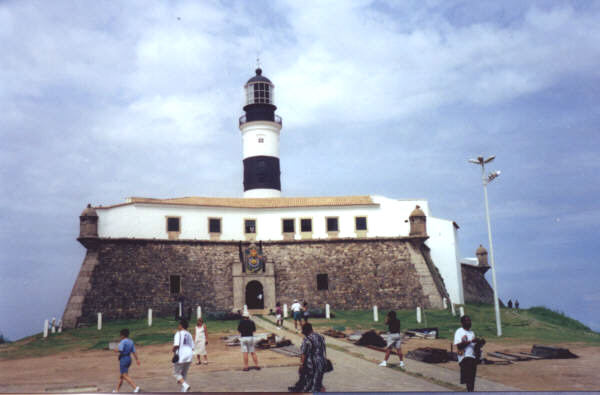 After breakfast, we boarded the bus and began our tour of Bahia's Lower City. Our first stop was the Forte de Santo Antônio da Barra, Bahia's oldest fort. There were lots of persistent street vendors there trying to sell beads and jewelry. This fort was built in 1598 to defend Bahia from the English and Dutch. For a few reals you could see the inside of the fort. Traci had a pretty bad stomach ache so we just took pictures of the outside of the fort and got back on the bus. Fortunately, Traci's upset stomach subsided very quickly.