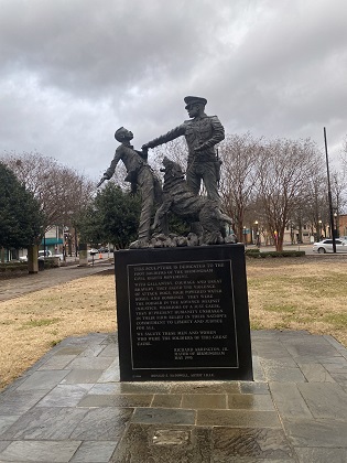 Located catty corner to the 16th Street Baptist Church is Kelly Ingram Park that contains monuments and sculptures that tells a story of Birmingham's civil rights struggles. Despite the cold wind and rain, Traci and I took a walk to the park to have a look at the sculptures. We noticed there was also a large tour group they're listening to a tour guide.