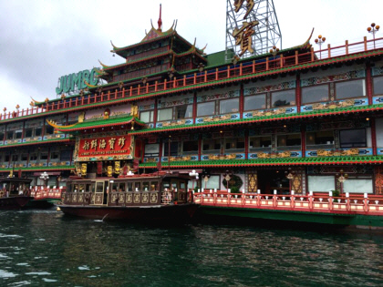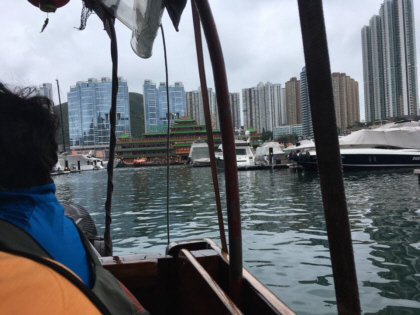 We were driven to a dock where we boarded a small Chinese boat called a sampan. Our destination was to a section of the harbor called the Aberdeen Fishing Village where the traditional “Boat People” live. They live on their sampans for most of the year and make a living by fishing. Their way of life is really dwindling. I don’t think I saw their community; however, I saw many fancy yachts as we navigated the harbor. We also went past the very elegant Jumbo Kingdom floating restaurant. Our guide told us it is really expensive to eat there. [Update: The restaurant closed in March 2020 due to the Coronavirus Pandemic and was never able to recover financially. In June 2022, it sank as it was being towed to a new location.]