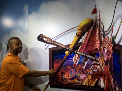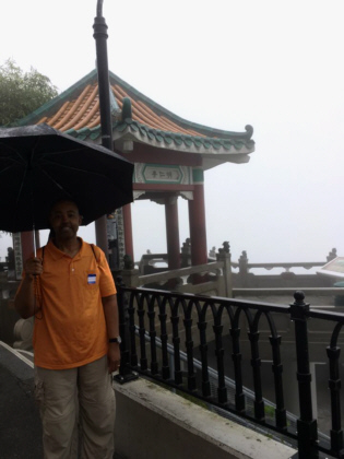 The rain had let up a little as we reached the top but a thick fog had moved in below thus preventing us from seeing the famous view of Hong Kong. Darn! Oh well, there were shops, eateries, and other diversion at the top of Victoria Peak to keep us occupied until we needed to regroup. Traci and I tried our hands at an exhibit that lets you take illusion photographs if you can line up the angles correctly.