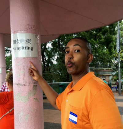 Our group was driven down the mountain by motorcoach instead of the tram. We stopped about half-way down for a photo opportunity. At this elevation, we were below the fog and had a decent view of the city. It was at this stop that I saw several signs that said “No spitting”. We asked our guide what this was about and he told us it was aimed mainly at the Mainland China visitors. He explained that spitting is socially acceptable in Mainland China but not in Hong Kong. He said we would see what he meant during the rest of our travels through the country. I did not witness much spitting during the Beijing leg of our trip but I did in the other Chinese cities we visited. The spitting is not a simple ‘twpuh’. Instead, it is a loud, hawking, throat-clearing build-up before the actual expulsion. I’ll admit it made me chuckle each time I heard this. Traci was not amused.