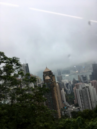 A local guide from Gray Line Tours arrived and led our group to the awaiting motorcoach. The rain was coming down in buckets. We arrived at our first destination - the Victoria Peak Tram. Viewing the city from the top of Victoria Peak I’m told is a must-do event in Hong Kong. We boarded the tram which has been taking visitors to the summit since 1888. It was an interesting ride up. The angle of our car made all the buildings appear to be tilted as we ascended the mountain.