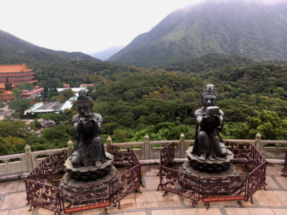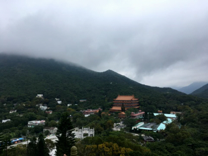 Traci and I spent time walking around the base of the statue admiring the elevated view of the surrounding mountains and valleys. We did not pay to enter the museum nor did we buy the vegetarian meal being sold. We descended the steps and wandered around the grounds for a bit. We saw the exterior of the nearby Po Lin Monastery. Our wandering led us through the Ngong Ping Village. It is full of touristy stuff, shops, and restaurants. Traci went in and out of the shops while I went from bench to bench. It was at this time that we ran into people from our tour group. They had paid for the optional Gray Line tour to Lantau Island. It sounds like they got more out of the experience than Traci and I did on our own. Their tour included a museum, a fishing village visit, and other stops.