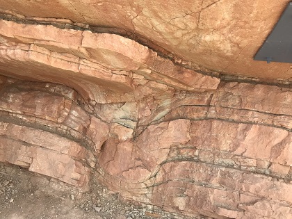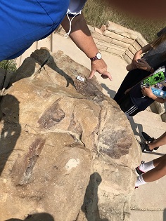 Our first stop was Dinosaur Ridge to see dinosaur footprints and fossils. This was more of an interest of mine than of Traci's. I had booked the 10:30 AM tour. We were loaded into a shuttle whose air condition struggled to keep up with the heat of the day. Masks were required while we were in the shuttle, but we could remove them when we were outside. We were driven to sites where paleontologists discovered the footprints of dinosaurs. The land containing the footprints has become rock hard after millions of years thus preserving the footsteps of these massive creatures. The strange thing about the site is that the land has shifted thus causing the footprints to appear as if the dinosaurs were walking up a vertical wall. Our guide assured us that the land was horizontal at the time of the dinosaurs. The 45-minute tour took us to other sites where we saw other sets of preserved dinosaur footprints and a few dinosaur bones encased in hardened earth. We had to really use our imagination to make out the bones. I enjoyed the tour; however, the thing that bothered me was that organization rubs charcoal in the footprints to make them easier for guests to distinguish. To me, the charcoal makes the footprints look fake. After our tour, Traci and I had a quick look at the dinosaur fossils on display at the main visitor center and had a good chat with the man who works there before getting back in the car to continue our journey along the Lariat Loop.
