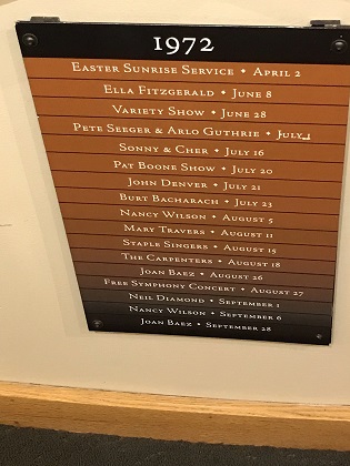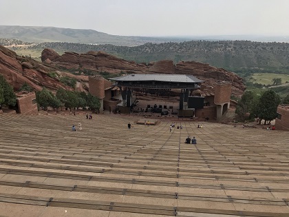 Traci and I spent some time walking through the visitor center at the top of the amphitheater. There are plaques on the wall that contain a list of all the concerts that were performed here over the years. There are other exhibits to see in the visitor center such as a film of interviews with artists who have performed at Red Rocks. Then of course there is a souvenir shop, but we did not buy anything. I really enjoyed my time at Red Rocks. It is a unique attraction.