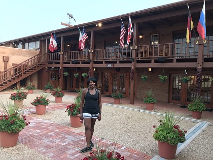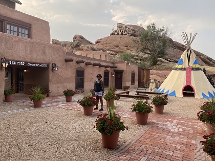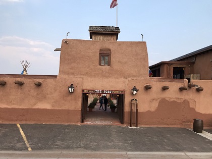 With all the stops we made that day, we had spent 8 hours traveling the 40-mile Lariat Loop. We hadn't eaten anything since breakfast, so we were quite hungry. We backtracked a little because I wanted to try a restaurant called The Fort. I had read about it during my research for this trip. The place is built in the form of an old adobe fort. Unfortunately, there was a wait list to be seated when we arrived. The manager was eager to have us stay. He invited us to their outdoor terrace to look at the menu while enjoying the pleasant evening weather and a nice (but hazy) view of the distant mountains. There was tranquil Indian pan flute music playing as we relaxed to the trickle of the nearby fountain. The manager returned several times to update us on the wait and to see if we wanted drinks or appetizers while waiting. Although the menu looked good and we appreciated the manager's efforts to earn our business, we decided not to eat at The Fort. I felt bad relaying our decision to the gentleman. I knew we had a 2-hour drive ahead of us to get to our lodging in Colorado Springs and I did not want to be driving on unfamiliar roads in the dark.