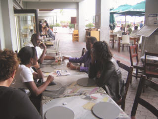 At the conclusion of the tour, our guide gave each passenger the option of being dropped off back at their hotel or at the V&A (Victoria & Alfred) Waterfront. The six of us chose the waterfront. The V&A Waterfront reminds me of a mixture between Fisherman's Wharf in San Francisco and the Baltimore Inner Harbor. There are so many stores here that it would probably take a person several days to visit all of them. Very good street performers keep the tourists entertained while scores of restaurants keep people fed. The six of us had lunch at an outdoor cafe called Rootis as we made plans for the rest of our day.
