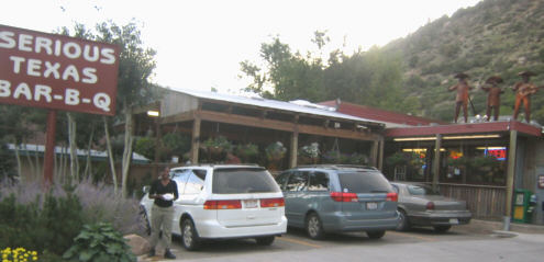 I noted the location of the Serious Texas Bar-B-Q restaurant our bus driver pointed out during our ride back to town. After our railroad museum visit, Traci and I got in the car and found our way there. I know what you're thinking. Why were we eating at a Texas BBQ joint in Colorado? Well, it turns out the owners are from Texas and the name of their restaurant says it all. This place definitely hit the spot. It is a no-frills restaurant. You order your meal at the counter. Your cooked meat is sliced and served to you on a piece of paper much like you would get at the deli counter of a grocery store. Your sides are served in small styrofoam containers. I ordered beef brisket with a side of beans and Traci ordered smoked turkey with a side of mac&cheese. On each table is barbeque sauce in liquor bottles. Our meal here was outstanding. I was too full to finish all of my beef brisket. Traci and I dined at the restaurant at the right time. There was no wait when we arrived but as we were leaving, the line was almost out the door and the parking lot was full. After eating here I could understand why.