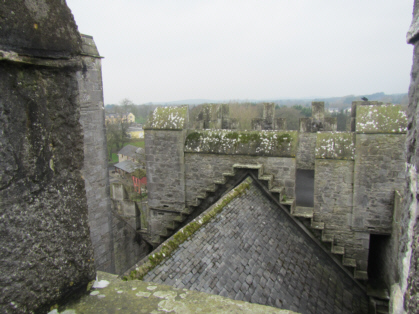 We were given an hour to explore the castle and the adjacent Folk Park on our own before we needed to be back on the bus. Bunratty Castle really impressed me. It is what I imaged a medieval castle to be. It was drafty. There are secret windows and doors. There is a dungeon. The castle has been furnished with period furniture and tapestries. Traci and I climbed the narrow staircases of each of the four towers and hung out on the roof of the castle.