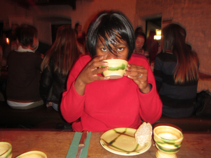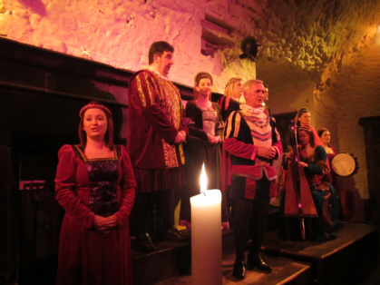 We were led upstairs to the dining hall and seated at long tables. We were served a four-course meal consisting of soup, chicken, spare ribs, vegetables, and dessert. Since this was a medieval banquet, we were not given any eating utensils other than a dagger (knife). We had to eat with our hands and drink our soup from the bowl. While enjoying the delicious meal, we were entertained by choral singers who sang Renaissance music and some traditional Irish songs. They sounded great. Occasionally, people were pulled from the audience to participate in the entertainment. I was volunteered to be an official taster for the king. The evening concluded with everyone being served tea downstairs before being sent on their way into the cold rainy night. It was a fun evening.