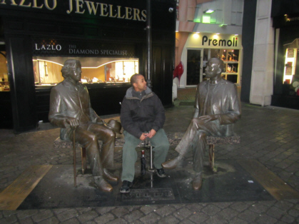Having found most of the attractions on the flashcard, we were feeling pretty good about ourselves. It was starting to rain and it was almost time for us to make our way back to the train station. However, Traci, being the thorough person she is, would not be truly happy until we found everything listed on the card. Our last site was a modern art creation in Eyre Square. We found it but Traci decided not to take a picture of it because it was rusted and contained graffiti.