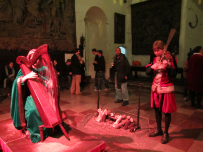 We were greeted by a host and hostess dressed in medieval fashion. They led us up a narrow spiral staircase where we joined other guests in a rustic reception hall. Everyone was served a honey wine called mead. I took a few sips. It was really good. We were entertained by a harpist and a fiddler. After a while, the host told us a little about the castle and some of the relics that were in the reception hall such as the 500-year old tapestries hanging from the walls.