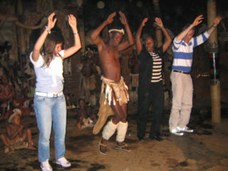 Some may argue that Shakaland is too commercialized. After all, the Protea Hotel chain has a registration desk in this recreated village offering tourists the opportunity to spend a night in a hotel room shaped like a Zulu hut. Additionally, on the way out, everyone passes by the souvenir shop selling all of the typical tourist items - t-shirts, postcards, fridge magnets, mouse pads, CDs, etc. However, for me, Shakaland was a fun, hands-on way to learn about Zulu history and culture. As I watched some small Zulu children try to imitate their parents as they performed for us, I thought to myself how wonderful it is that knowledge of their culture has a chance of surviving in this fast-changing world. Continue to Cape Town...