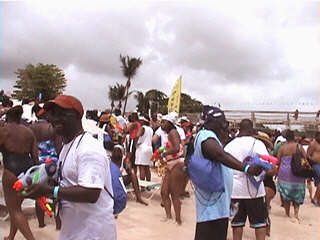 The main event of the beach party was the annual water gun battle of the light-skinned people versus the dark-skinned people. There was a supply of water guns for everyone. At the height of the battle, there were about 200 people running around the beach squirting water at each other. I'm not sure which side won. Traci joined the battle but I didn't because I was trying to capture the action with my camcorder. I couldn't take a chance on getting my camera wet. However, I did get hit a few times followed by a "Oops! Sorry! I thought you were holding a gun.". As the battle winded down, it began to rain heavily; thus, everyone ran for the shuttles back to the ship.