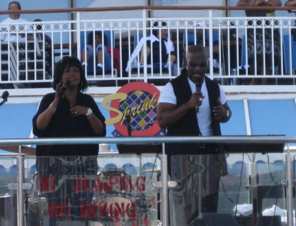 There were two days at sea during this cruise. The mornings and afternoons offered fitness classes, seminars, worship services, line dance instruction, panel discussions, poolside performances, live radio shows, and more. The ship's daily publication (Freestyle Daily) was delivered to our cabin each evening. It listed the schedule for all these activities. Just in case we didn't read the Freestyle Daily, Radio One always made sure everyone knew the activity lineup of the day. Starting at 7 AM each morning and continuing at regular intervals throughout the day, the activities were announced over the ship's PA system. Every morning we awoke to the voice of Winston Chaney reading the schedule of events.