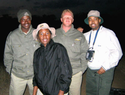 posing with our tracker: Thembe (left) and driver: Paul (middle)
