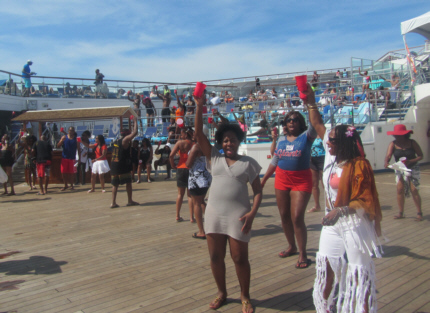 The theme for the evening was Boogie Night (a.k.a. 70’s Night) during which passengers dressed in clothing from the 1970’s. Traci and I did not bring any attire for the theme but Traci decided to wear her hair as afro puffs. There was no 8 PM music concert. Instead, there was a 9:15 comedy show on the main stage which featured Ty Barnett, Percy Crews, and Sinbad. It was a funny show. Sinbad seemed to be enjoying himself so much that he did not keep track of the time. The organizers had to cut him off at midnight so that people could go upstairs to the Pool Deck for the 70’s party. Capital Jazz was trying to set the world record for the longest Soul Train line. Every few minutes someone on a microphone would announce the number of people counted. The last count I heard was somewhere around 300. I don’t know how they determined who was in line and who was not. The deck was crowded with partiers. Regardless of the outcome, the music was good and it was fun to catch up with people we had met during meals and on shore excursions. I was terrible at remembering their names but I remembered their faces and where they were from. Continue...