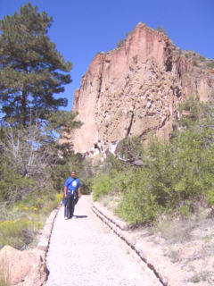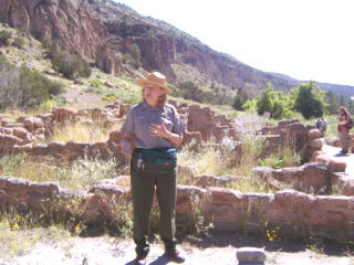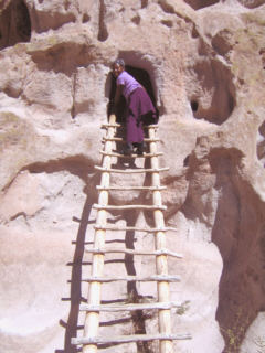 Tuesday was our day to enjoy the Great Outdoors. We took a half hour drive to Bandelier National Monument. This park is known for its ancient Indian dwellings as well as its spectacular canyons. Traci and I decided to do the 1-mile Main Loop Trail that begins and ends at the visitor center. A park ranger narrated the first 1/4 mile and then left us to explore on our own. I was glad we did the guided portion of the hike; otherwise, we would have walked by so many treasures without knowing the significance. The ranger pointed out different types of volcanic rocks that had uses such as arrow heads and carving tools. She showed the many uses of the yucca plant. For example, the Indians used it as soap. She showed us how the roots become sudsy when added to water. We were shown a large round, stone-walled pit in the ground called a kiva. It is believed the Indians used this for ceremonies and meetings.