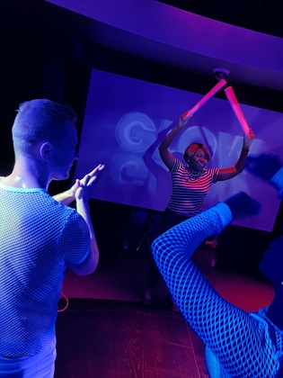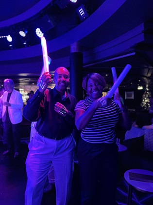 Our evening was not quite done. We attended the 10 PM Glow Party in which the staff applied neon paint to the face and hands of passengers so that they would glow under the ultraviolet lights as they partied. It was a fun party. By this time, even the assistant cruise director, Joey, knew Traci by name. He invited her on the stage to dance. Our only disappointment is that we missed the part in the daily cruise documentation that encouraged people to wear white. We had brought white clothes on the cruise but did not realize that this was the night we were supposed to wear them.