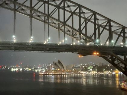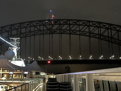 I did not sleep well that night for some reason. This was a rare occurrence for me. It turned out to be a blessing. Around 4 AM, I started hearing people talking outside the ship. I looked out from our balcony and saw the lights of Sydney. I did not see the source of the talking; however, I am assuming I was hearing conversations between the pilot boat crew the crew of our ship. I put on some clothes and went to the top deck of the ship. I arrived just in time to see our ship pass under the Sydney Harbour Bridge on that rainy morning. Continue...