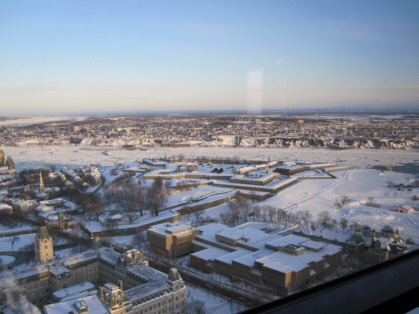 Our final stop on our sightseeing outing was the Capital Observatory (L'Observatoire de la Capitale). This 31-story skyscraper offers visitors an awesome overview of the city - visually and literally. It was $10 per person to ride the elevator to the 31st floor. Once at the top, Traci and I spent an hour and a half walking around admiring the view of the city in all directions through the large windows. I was sorry we did not start our vacation here because there was a short film called The Six Capitals that played continuously. The film gave an outstanding summary of Quebec's 400-year history, its neighborhoods, and its culture. This was the information I had hoped to get from the Quebec Experience attraction we tried to visit on our first day. Nonetheless, the film validated Traci and I had made good progress in seeing the city through guided tours and our own sightseeing.